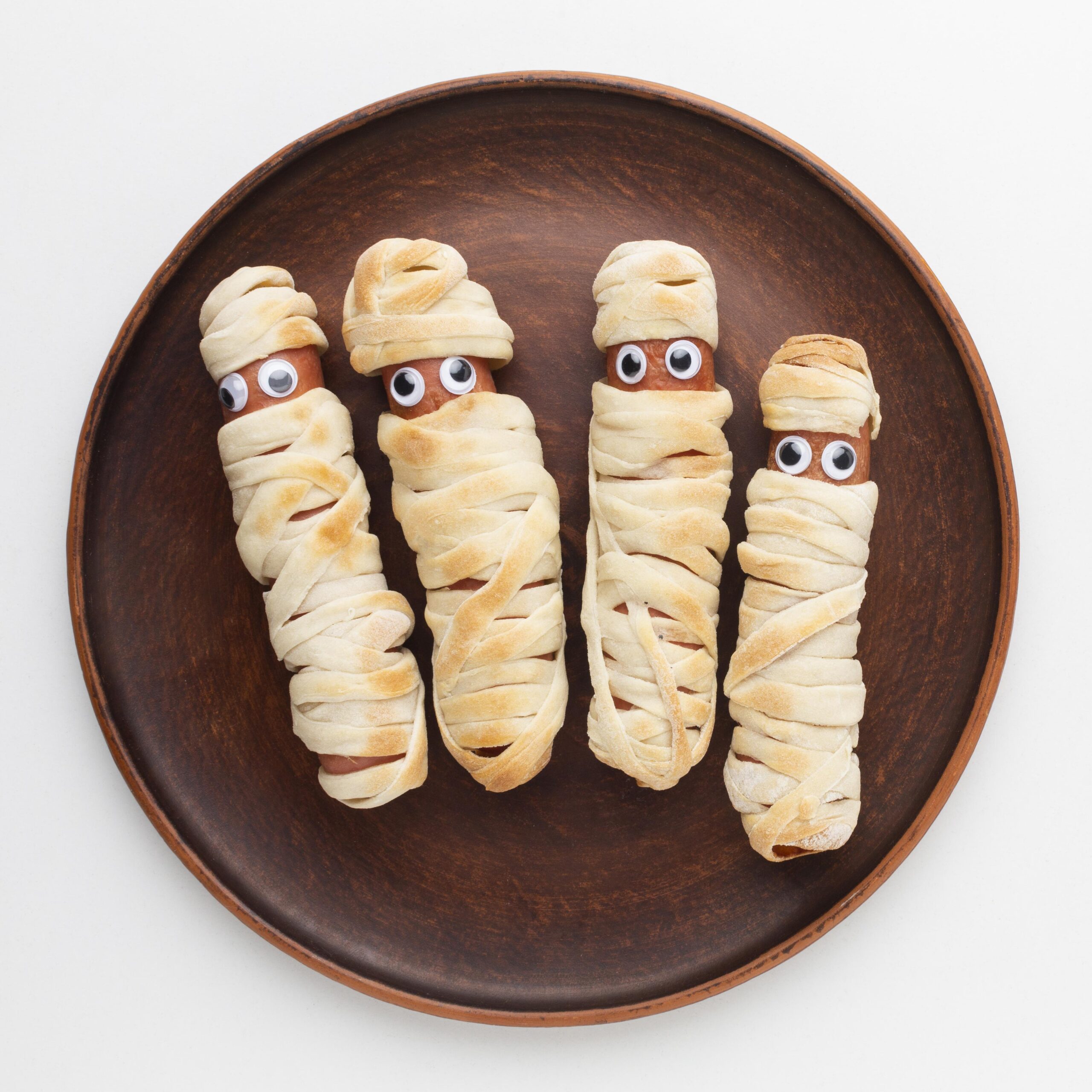 También puedes pelar tiras finas de zanahoria y envolver bastones de queso bajo en sal: ¡parecerán momias miniatura! 👻