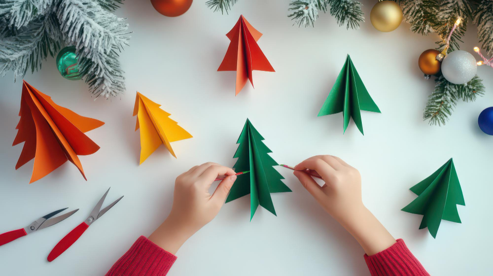 Convierte un momento en familia en una actividad llena de creatividad con estos árboles navideños de papel. Una manualidad sencilla para decorar tu hogar mientras los más pequeños disfrutan creando su propio bosque navideño. ¡Manos a la obra!
